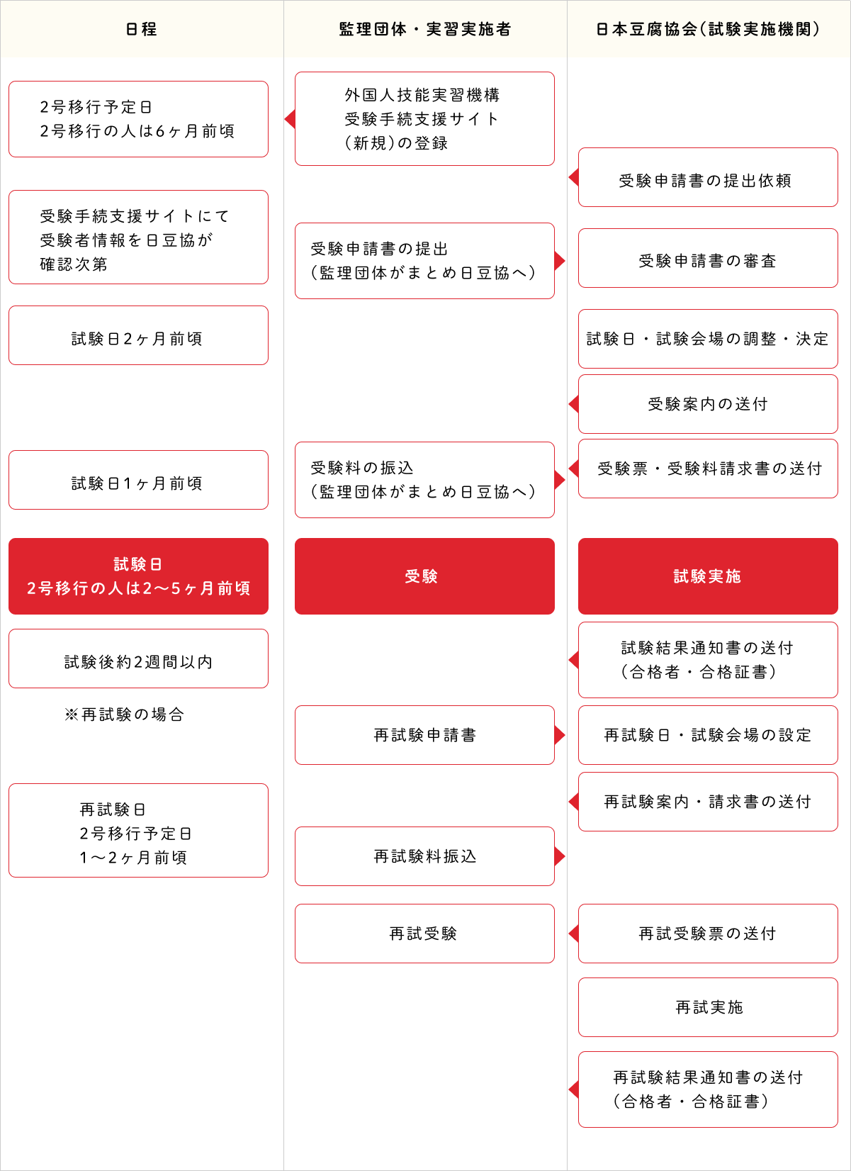 日本豆腐協会(以下「日豆協」という。)が、外国人技能実習機構の受検手続支援サイトにて受検情報を確認しましたら、日豆協は「豆腐製造業技能実習評価試験受検申請書(初級)」の提出依頼を監理団体へメールで送付します。